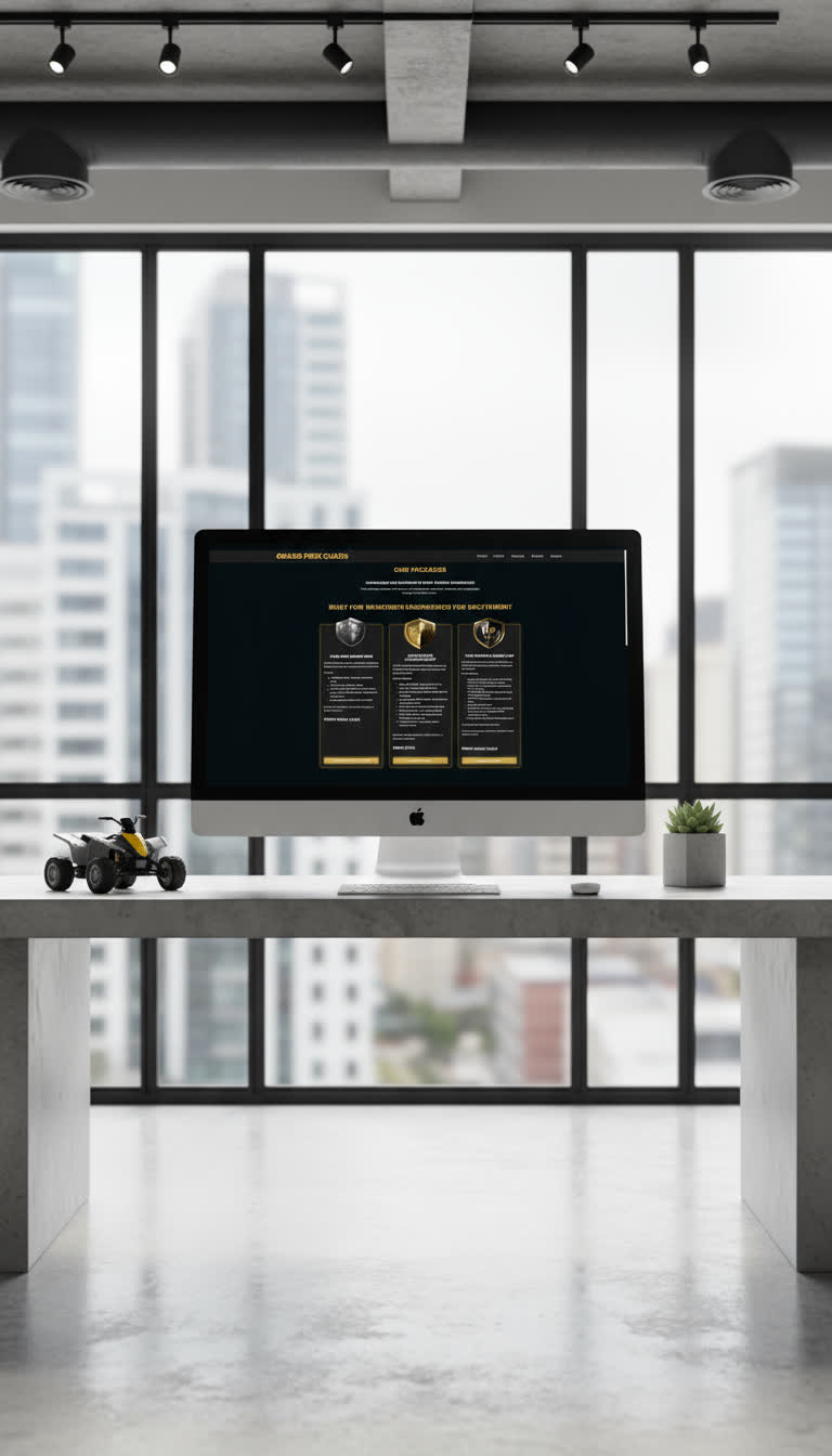 Presentation: Large, realistic Imac or Desktop Mockup with the website loaded, placed in a bright, modern office or a clean, industrial setting (to match the “quads” product).